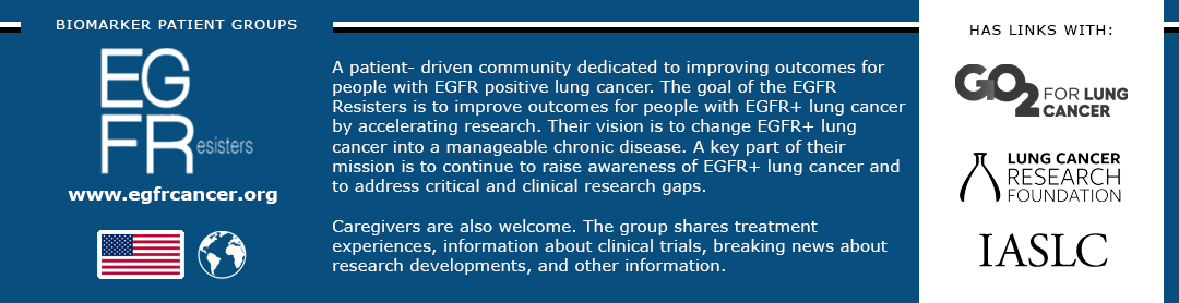 A patient- driven community dedicated to improving outcomes for people with EGFR positive lung cancer. The goal of the EGFR Resisters is to improve outcomes for people with EGFR+ lung cancer by accelerating research. Their vision is to change EGFR+ lung cancer into a manageable chronic disease. A key part of their mission is to continue to raise awareness of EGFR+ lung cancer and to address critical and clinical research gaps.